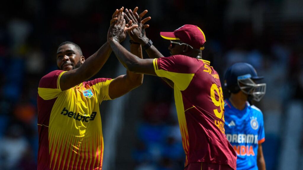 भारत ने पहले बल्लेबाजी की और निर्धारित 20 ओवरों में 165/9 रन बनाए। सूर्यकुमार यादव ने सबसे ज़यादा 61 रन बनाए, जबकि तिलक वर्मा ने 27 रन बनाए। वेस्टइंडीज के लिए अकील होसेन ने 2 और रोमारियो शेफर्ड ने 4 विकेट लिए।